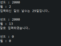 문제) 연도와 월을 입력받아 해당 월의 날수를 출력하다가 월이 0이면 종료하는 프로그램 (while이용)